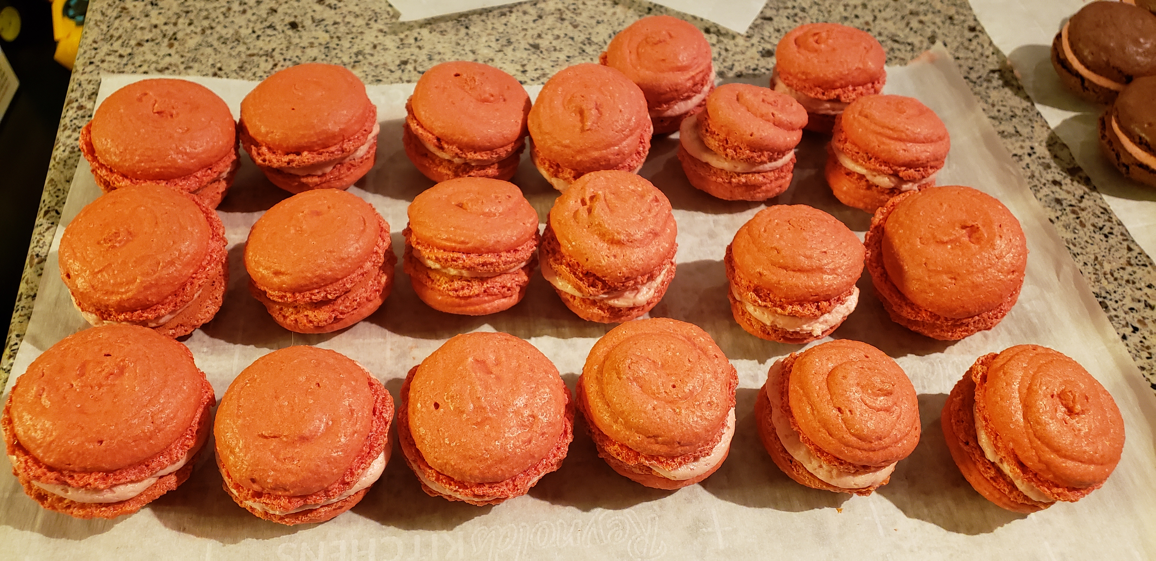 First, they’re supposed to be pink. I can’t decide if I didn’t add enough red or if I should have added less for a lighter pink, but somehow they came out a dusty rose color. Reminds me of my parents living room walls in the 80’s. Second, I’m pretty sure I beat the egg whites to within an inch of their lives making the batter so stiff that the cookies grew lopsided when baked. On the up side, the chocolate macarons don’t look completely horrible.